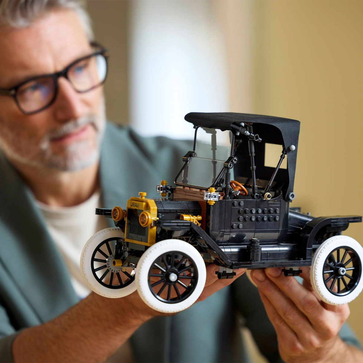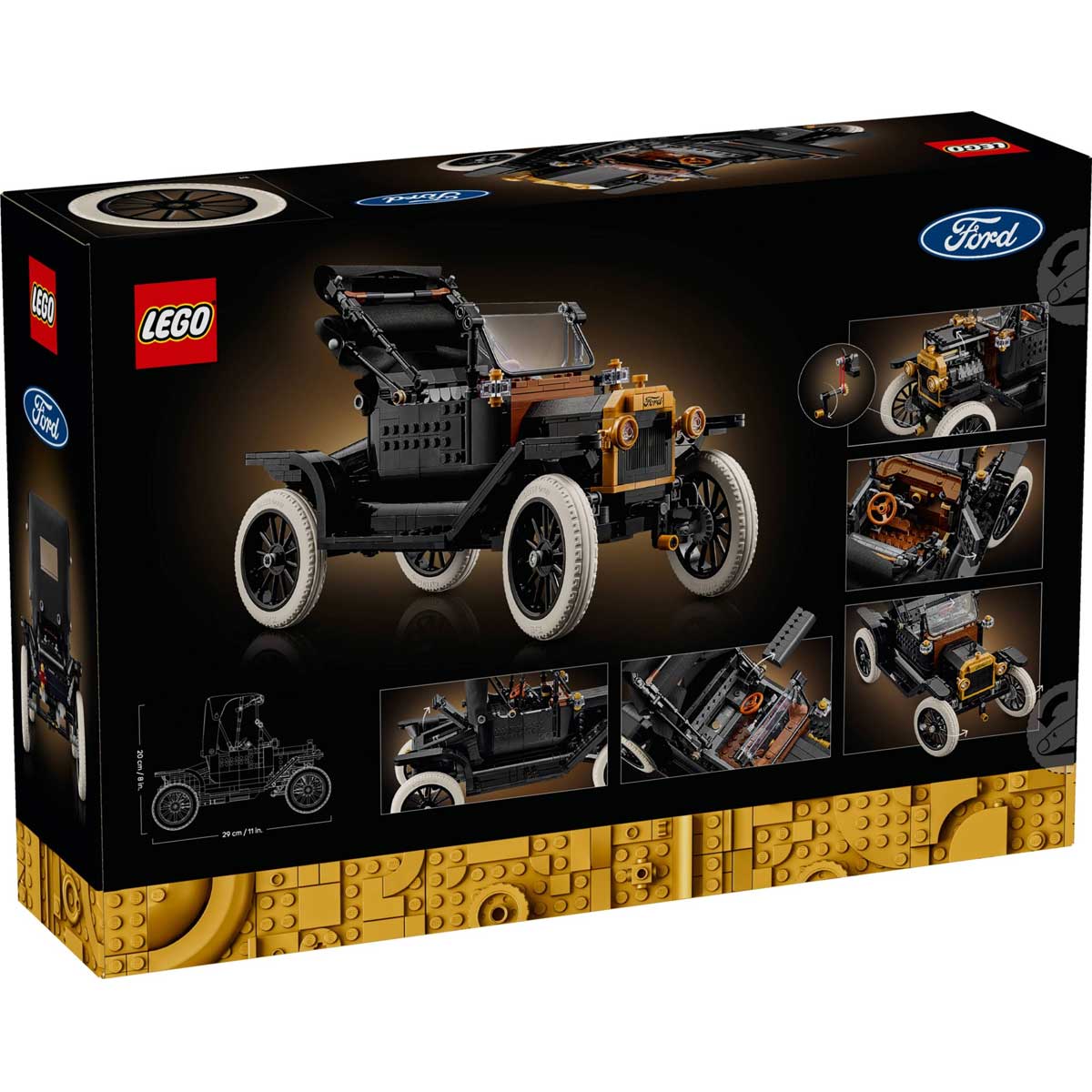 ΠΕΡΙΓΡΑΦΗ ΠΡΟΪΟΝΤΟΣLEGO 11376 - Ford Model TΚατηγορία : LEGO EXCLUSIVES Φτιάξτε ένα αφιέρωμα σε ένα σύμβολο της ιστορίας της αυτοκινητοβιομηχανίας με το σετ μοντέλου αυτοκινήτου LEGO® Icons Ford Model T (11376) για ενήλικες. Αυτό το αυθεντικό αντίγραφο του αυτοκινήτου της δεκαετίας του 1910 διαθέτει αναδιπλούμενη υφασμάτινη οροφή, αναδιπλούμενο, διαχωρισμένο παρμπρίζ και μία πόρτα συνοδηγού που ανοίγει. Άλλα χαρακτηριστικά περιλαμβάνουν πορτμπαγκάζ που ανοίγει και εξαιρετικά λεπτομερή καμπίνα οδηγού με λειτουργικό τιμόνι. Σηκώστε το κάθισμα για να αποκτήσετε πρόσβαση στο ρεζερβουάρ βενζίνης. Σηκώστε τα πάνελ του καπό και από τις δύο πλευρές και αποκαλύψτε τον κινητήρα και γυρίστε τη μανιβέλα για να περιστρέψετε τον ανεμιστήρα. Με μαύρο αμάξωμα, χρυσές λεπτομέρειες και ψηλές, ακτινωτές ζάντες με λεπτά ελαστικά από καουτσούκ, αυτό το μοντέλο του vintage αυτοκινήτου γίνεται ένα κομψό διακοσμητικό για το σπίτι ή το γραφείο. Αυτό το κορυφαίο μοντέλο είναι εξαιρετική ιδέα δώρου για λάτρεις των κλασικών αμερικανικών αυτοκινήτων. Ανακαλύψτε την εμπνευσμένη σειρά από δημιουργικά LEGO® πρότζεκτ για ενήλικες (πωλούνται χωριστά). Κατασκευάστε πιο έξυπνα με την εφαρμογή LEGO Builder – ζουμάρετε, περιστρέψτε σε 3D, παρακολουθήστε την πρόοδο και ακολουθήστε αναλυτικές ψηφιακές οδηγίες. Το σετ περιέχει 1.060 τεμάχια. ΧΑΡΑΚΤΗΡΙΣΤΙΚΑ ΠΡΟΪΟΝΤΟΣ